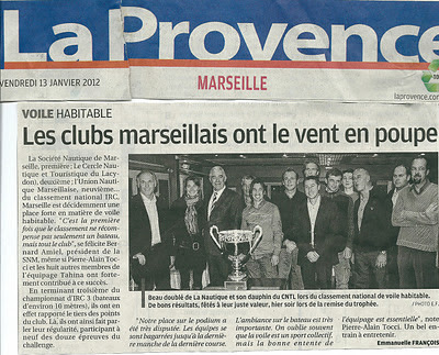 Article de La Provence relatant la soirée organisée par la Société Nautique de Marseille pour feter sa victoire au 1° trophée des Clubs IRC. A rajouter que ce sont les points cumulés du First 35 Tahina, du Bella Donna et bien sur du A40 Rc Glen Ellen V qui permettent cette victoire devant une autre club Marseillais, le CNTL;