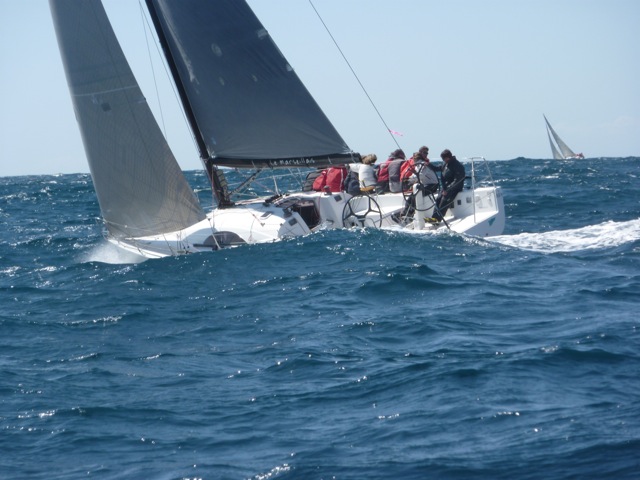 2° manche : plus compliquée pour nous avec des petites rotations et petits croisements à notre désavantage...4° derrière notre sistership Ville de Leucate (Sealance), X'presso et Sayann qui remporte cette manche.