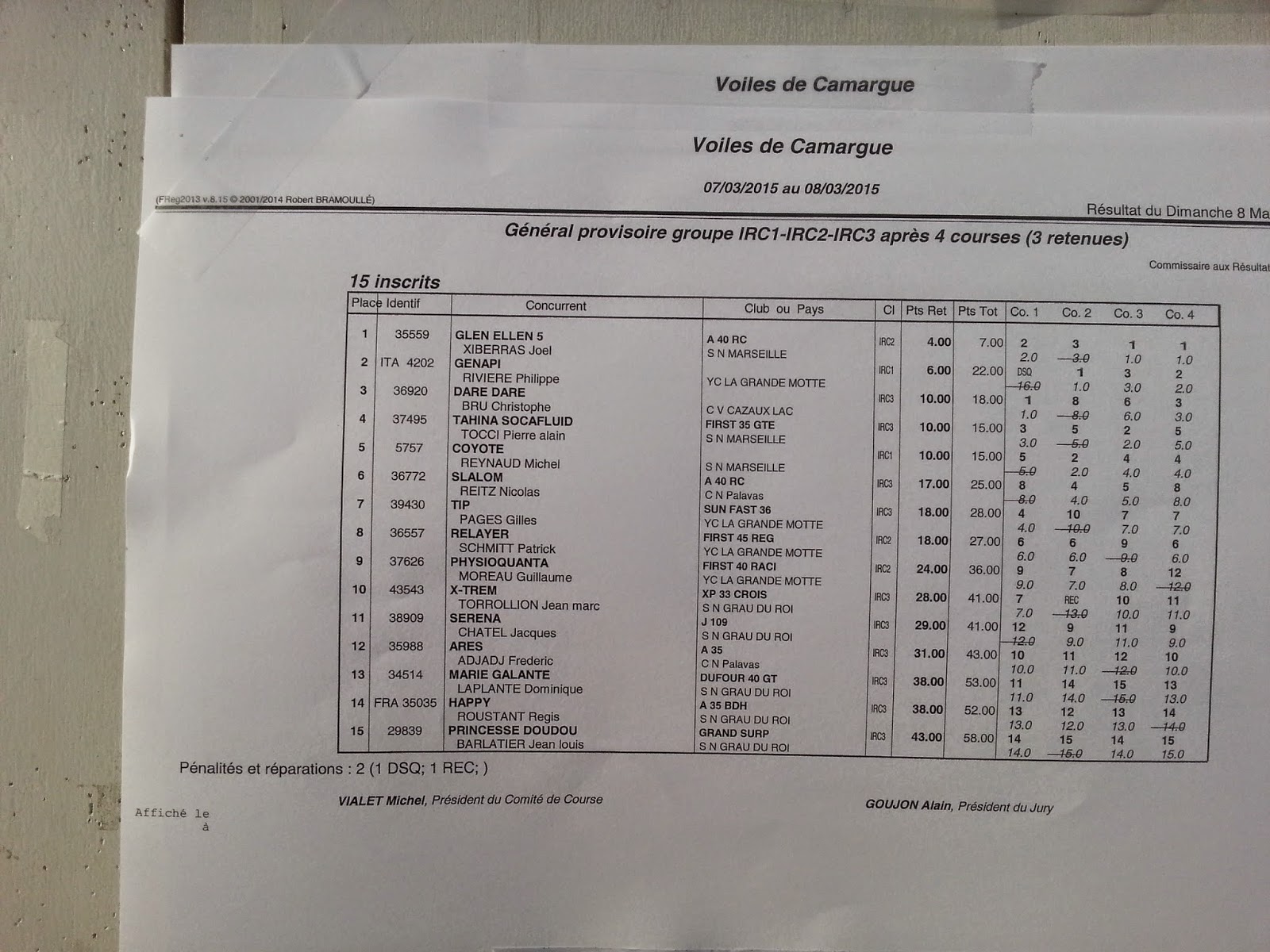 Une 1° journée de petit temps entre coupé d’une risée de 20 minutes à 165 nds ( ?), avec 2 manches ou nous jouons la régularité (3° et 2°), laissant Dare Dare et le GP42 Génapi gagné 1 manche chacun... En tête au classement Général devant l’IMS52 Coyote (5° et 2°) et les amis de Tahina (3° et 5°).
